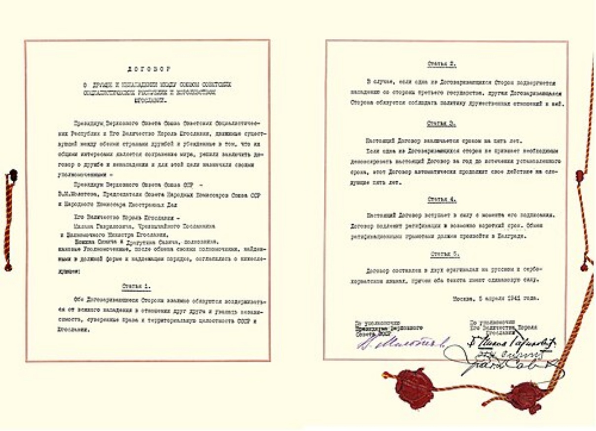 Дана 2. априла 1941. у Москву су стигли југословенски представници Божин Симић и Драгутин Савић. Пре потписивања уговора, Вјачеслав Молотов је уверавао немачког амбасадора Шуленбурга да ће овај уговор бити копија совјетско – турског споразума из 1925. године.