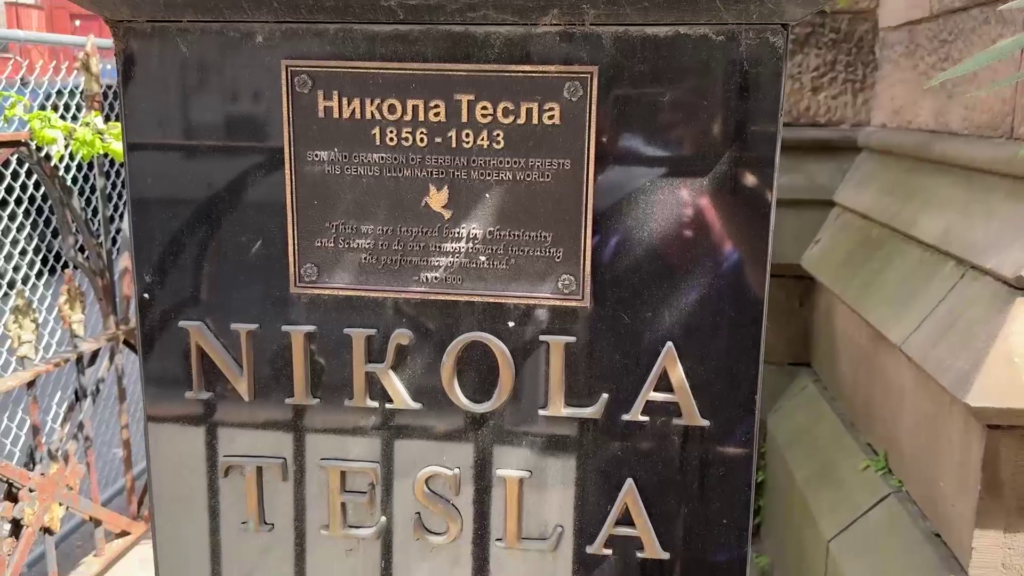 Поред цркве налазе се велике бисте Николе Тесле и Михаила Пупина, као и владике Николаја.